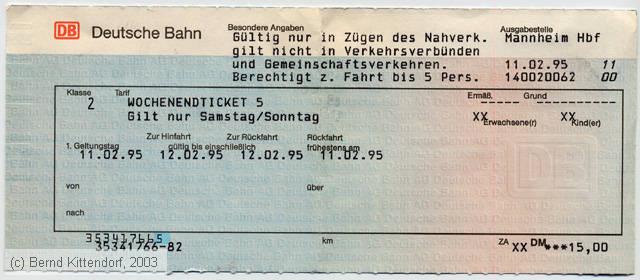 Deutsche Bahn - Fahrkarten - Wochenendticket Die Abbildung zeigt ein Wochenendticket, das am 11.02.1995 am Schalter in Mannheim Hauptbahnhof gekauft wurde.