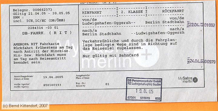 Deutsche Bahn - RIT-Fahrkarte Diese Fahrkarte wurde mit einer Reisebüro-Buchung verkauft. Sie galt für die Fahrt von Ludwigshafen Oggersheim nach Berlin Stadtbahn und zurück und wurde am 19. April 2005 gelöst. Diese Version gilt nur für Inhaber einer BahnCard. Abmessungen: 209 x 98 mm