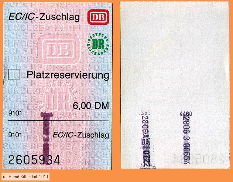 Deutsche Bundesbahn und Deutsche Reichsbahn - EC / IC Zuschlag IC-Zuschlag von einem Fahrkartenblock, ausgegeben am 28. Juni 1995 für 6,00 DM. Rechts oben sind die Logos der Deutschen Bundesbahn und der Deutschen Reichsbahn zu sehen. Abmessungen: 55 x 85 mm