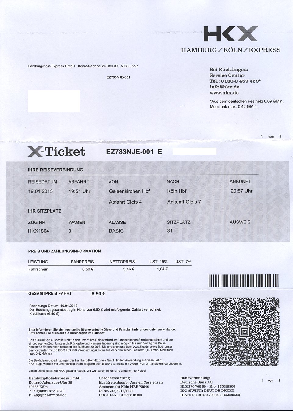 HKX online ticket Gelsenkirchen-Köln 19.1.2013 |