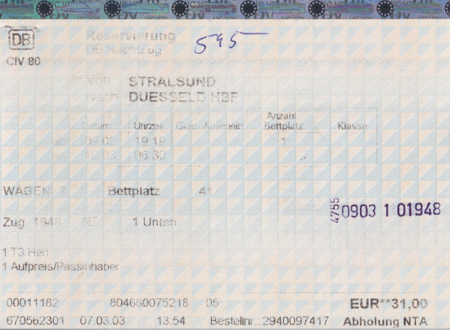 DB Nachtzug Reservierung 1 Bettplatz T3 Stralsund - Düsseldorf Hbf NZ 1948 9.03.2003 19:19 Abholung am Automaten nach telefonischer Bestellung Scan: M. Freitag (androstan@web.de) |