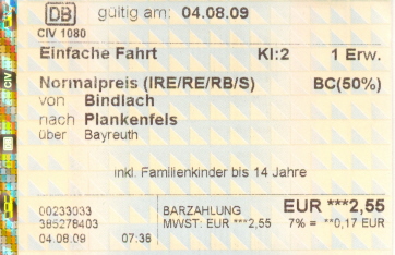 Fahrschein zum Bus-Schiene-Tarif Bindlach-Plankenfels aus DB-Nahverkehrsautomaten 04.08.2009 Daniel M. |