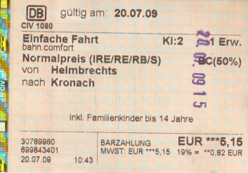 Fahrschein zum Normalpreis mit BahnCard 50 von Ebing nach Bergtheim, ausgegeben vom Schaffner im Zug 11.07.2009 Daniel M. |