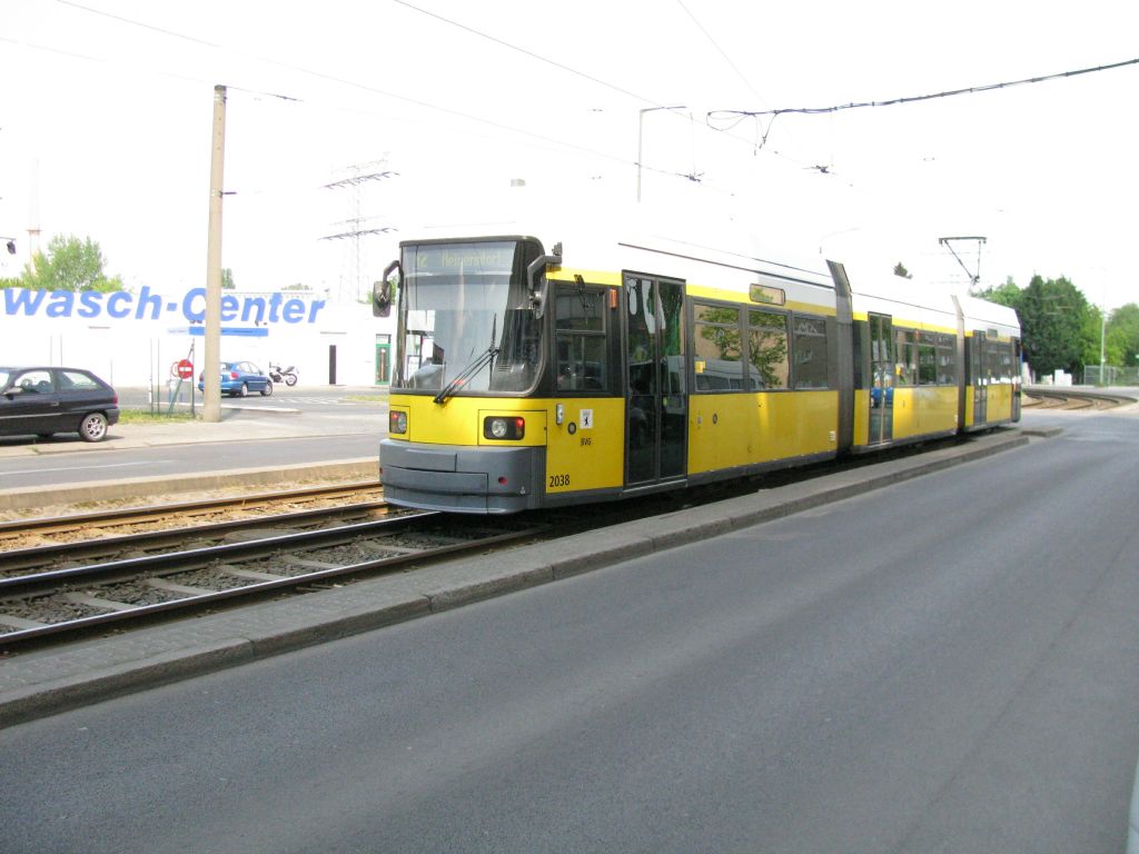 Straßenbahn Berlin - 2038 Triebwagen 2038 auf Linie M10 bei der Haltestelle Bersarinplatz am Kreisverkehr, aufgenommen am 17. Juni 2010.