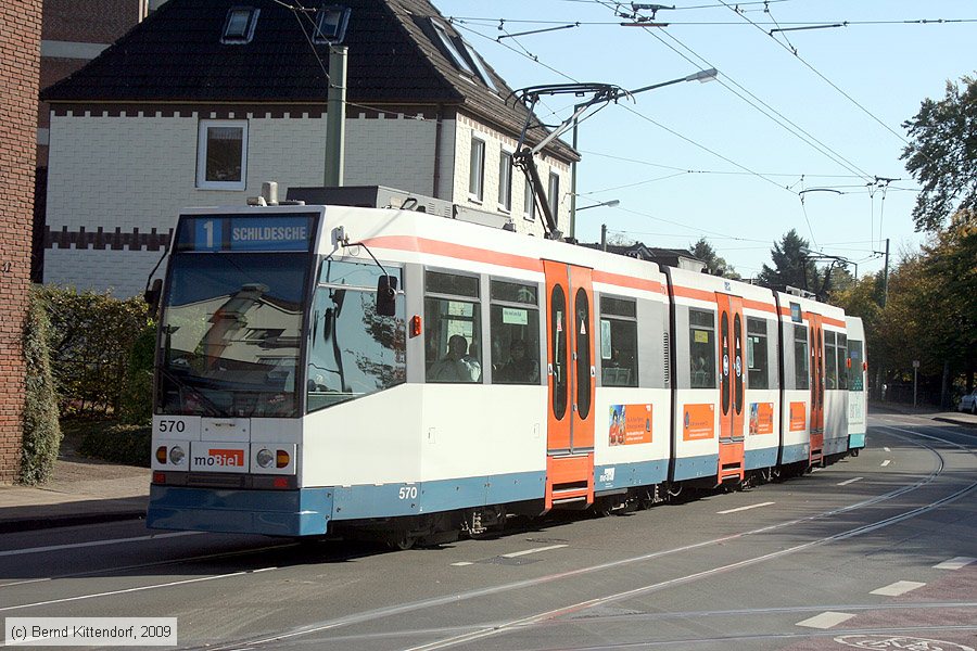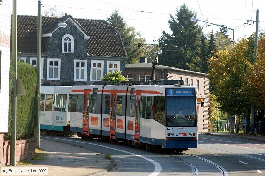 Straßenbahn Bielefeld - 570 Triebwagen 570 auf Linie 1 nahe der Haltestelle Brackwede Kirche, aufgenommen am 20. Oktober 2009.