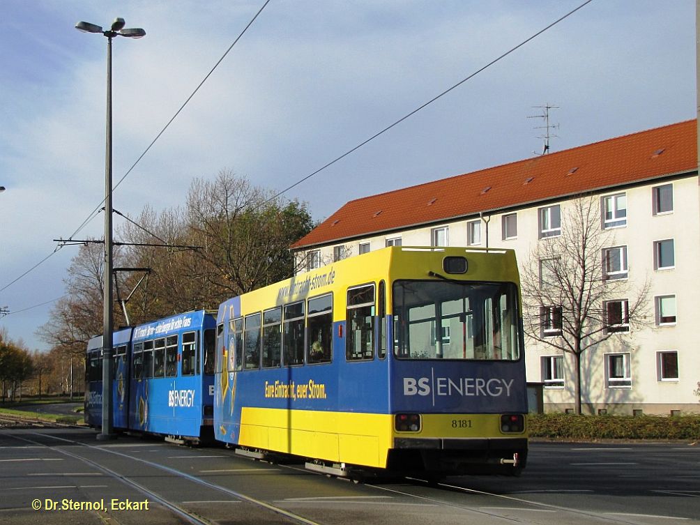 | Tram 8152 und Bw 8181 haben auf Linie 5 nach Broitzem die Hst Cyriaksring eben verlassen. Dr.Sternol, Eckart (Foto), Dr.Sternol@t-online.de |