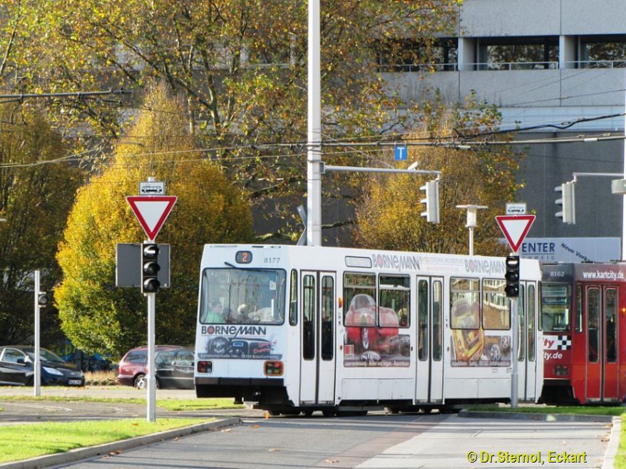 | Bw 8177 hinter Tram 8162, Linie 2 nach Heidberg, nach der Hst. Hbf. Dr.Sternol, Eckart (Foto), Dr.Sternol@t-online.de |