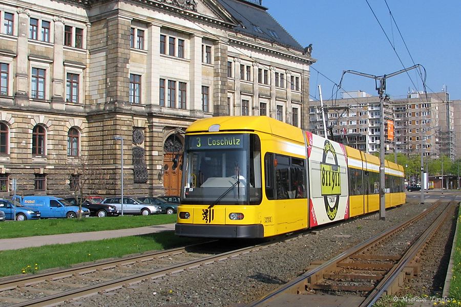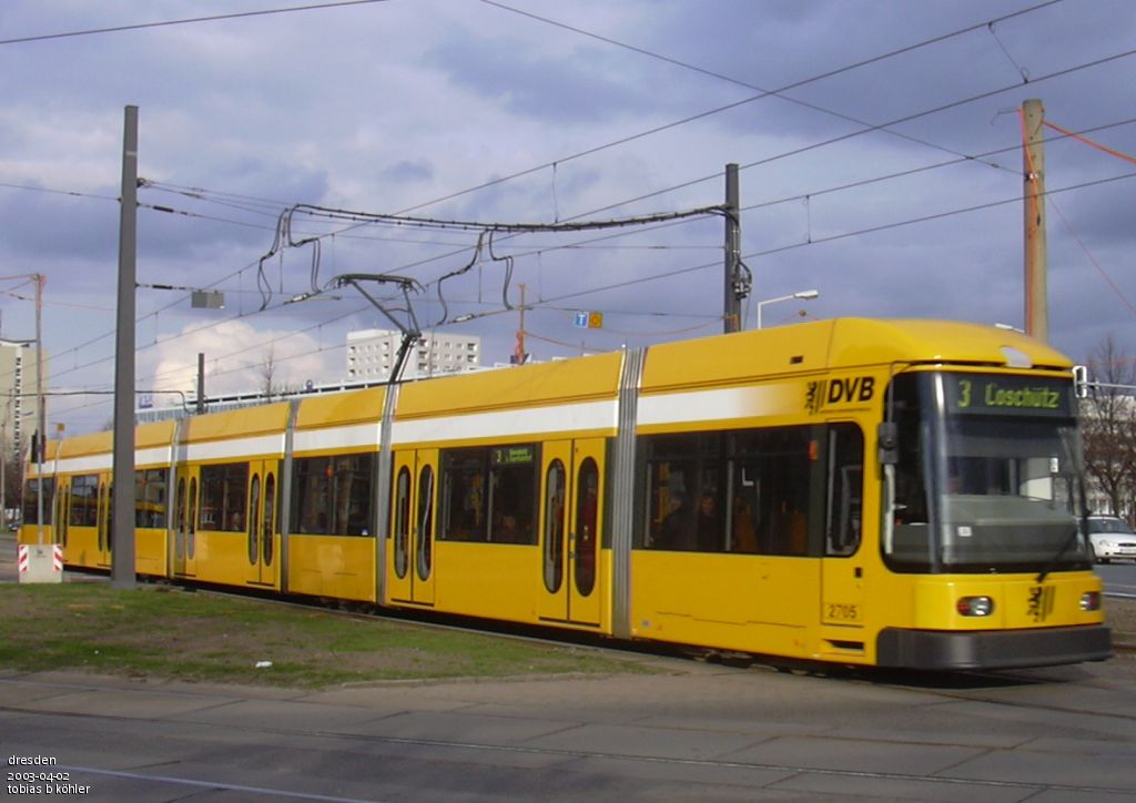 Straßenbahn Dresden - 2703 Triebwagen 2703 am 13. Mai 2006 auf Linie 3 beim Bahnhof Neustadt.