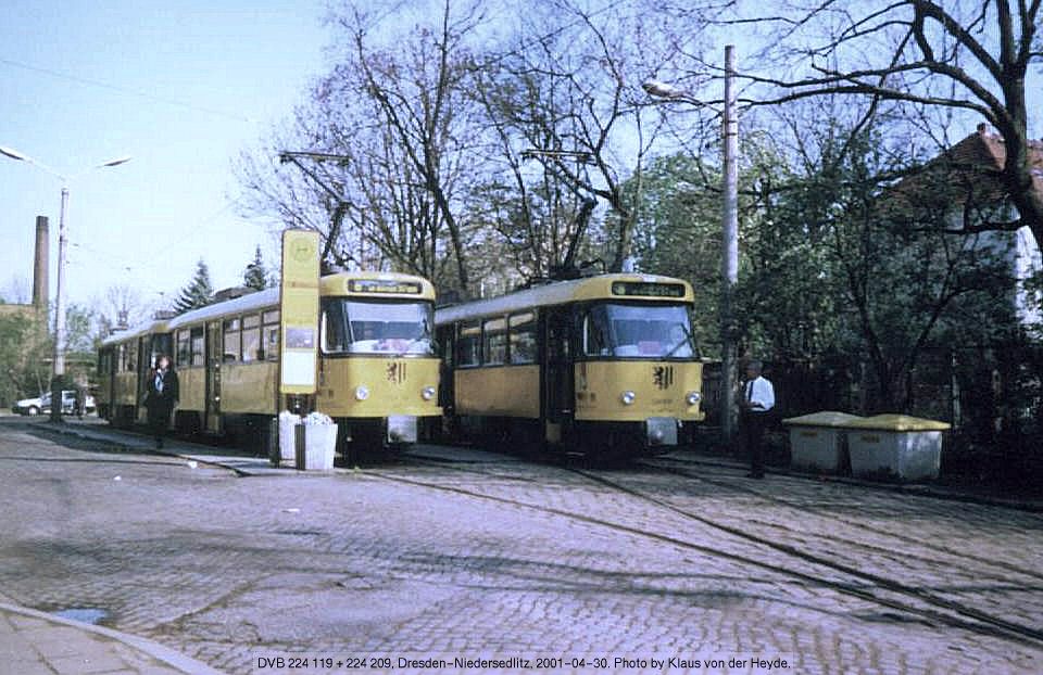Modernised Tatra tram motor units 224 119 (left) and 224 209 (right), each with an unpowered trailer, waiting at Dresden-Niedersedlitz station for their next duty on line 6 in the morning of 2001-04-30. The orange boards with the "6" indicate that this line is re-routed because of track works. They are yellow, otherwise. Dresden-Niedersedlitz, 2001-04-30. Photo and scan by: Klaus von der Heyde |