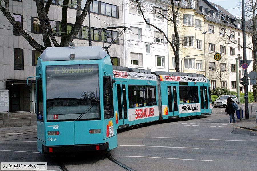 Straßenbahn Frankfurt (Main) - 025 Triebwagen 025 auf Linie 15 an der Haltestelle Stresemannallee/Gartenstraße am 02. Mai 2008.