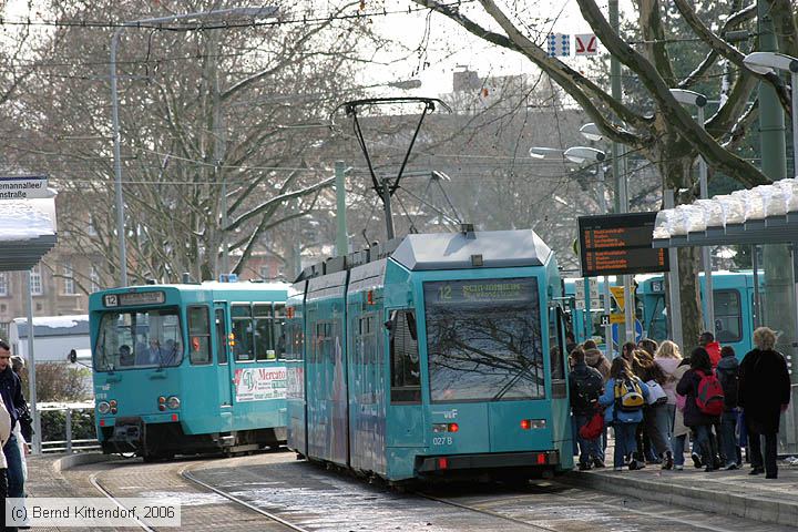 Straßenbahn Frankfurt (Main) - 027 Triebwagen 027 (rechts im Bild) und 678 (links im Bild) auf Linie 12 an der Haltestelle Stresemannallee/Gartenstraße am 06. März 2006.
