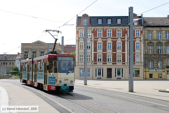 Straßenbahn Frankfurt (Oder) - 205 Triebwagen 205 auf Linie 6 beim Bahnhof, aufgenommen am 20. Mai 2005.