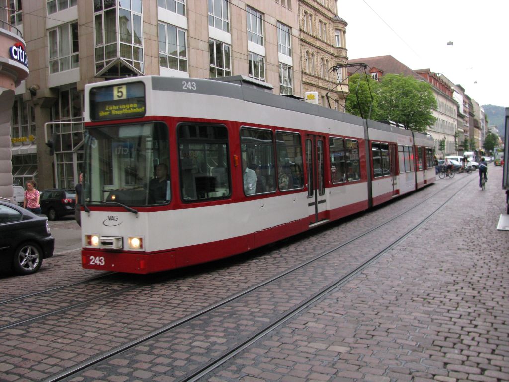 Straßenbahn Freiburg im Breisgau - 243 Triebwagen 243 beim Bertoldsbrunnen am 06. August 2007.