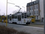 Straßenbahn Gera - 350 Triebwagen 350 nahe der Haltestelle Friedrich Engels Straße. Der führende Triebwagen wurde um ein Niederflur-Mittelteil verlängert. Der Geraer Verkehrsbetrieb setzt sechs dieser 26,55 m langen, 2,20 m breiten und als KTNF8 bezeichneten Fahrzeuge ein. Der KT4D dahinter ist etwa 19 Meter lang. (09. August 2004)