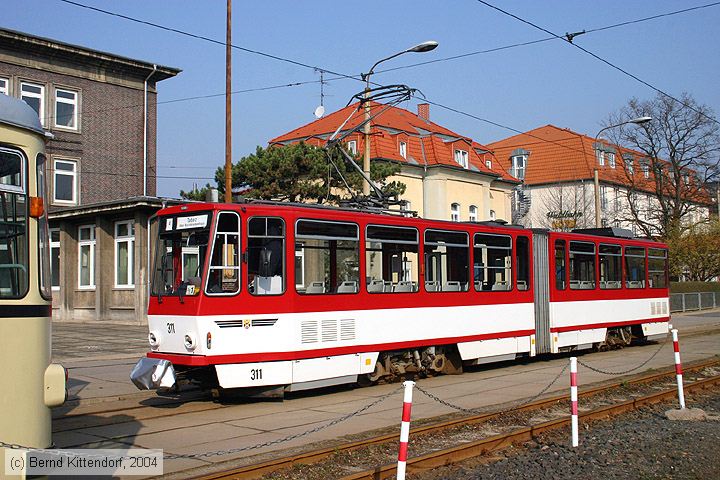 Gotha - 311 Straßenbahntriebwagen 311 am Bahnhof Gotha am 09. August 2004.