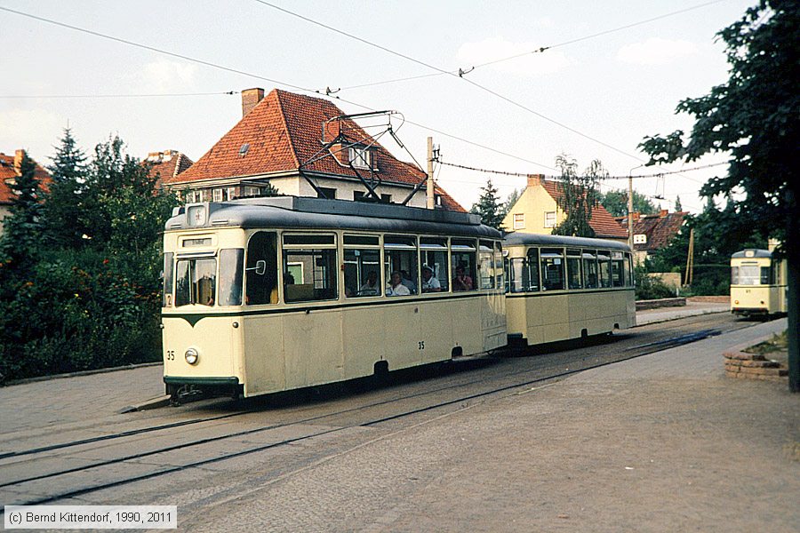 Straßenbahn Halberstadt - 35 Triebwagen 35II (Typ TE70, Hersteller Reichsbahnausbesserungswerk Berlin Schöneweide, Baujahr 1970), aufgenommen am 27. Juli 1990.