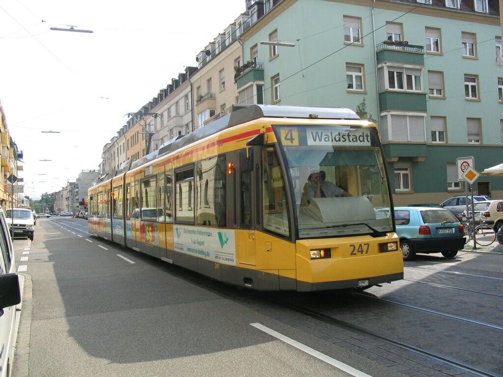 Straßenbahn Karlsruhe - 247 Triebwagen 247 auf Linie 6 bei der Haltestelle Philippstraße am 09. April 2010.