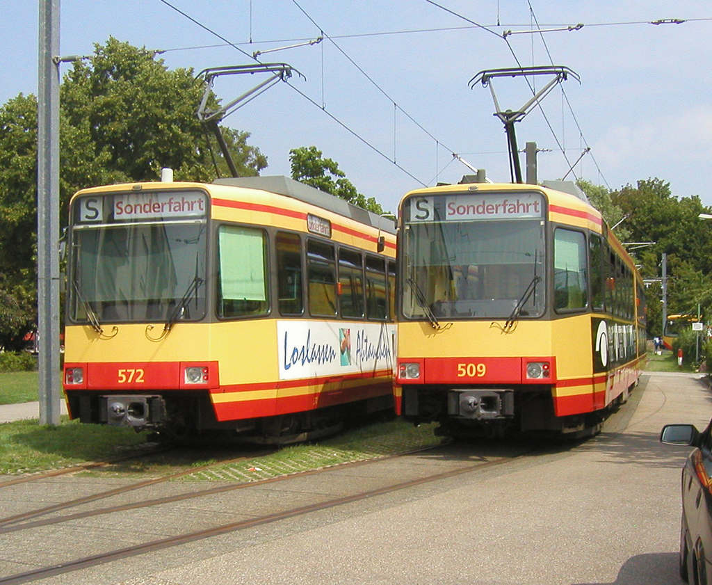 | VBK trams number 572 and 509 seen at Karlsruhe on 23/07/04 Photo johnturner16@yahoo.co.uk |