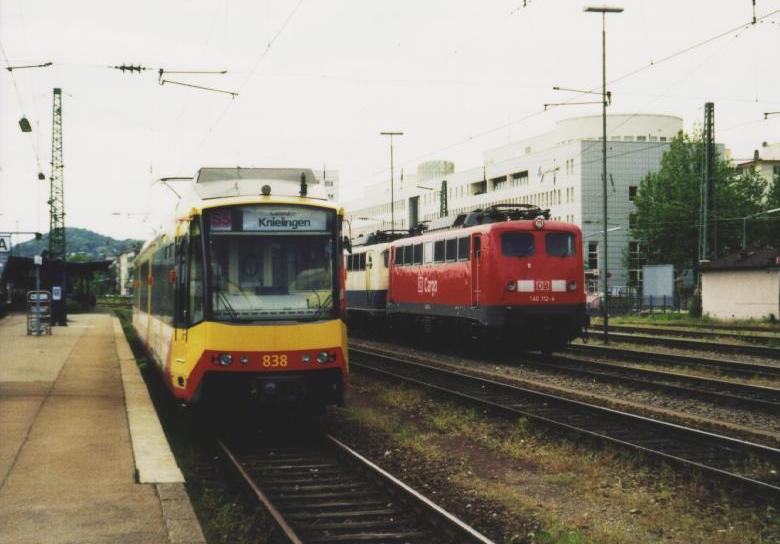 AVG dual-system light rail car 838 next to DB Cargo electric 140 112-4 in the new "verkehrsrot" livery and another 140 in ivory/turquoise livery