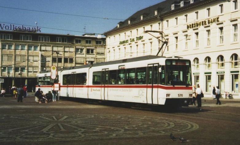 VBK light rail vehicle no. 870 (since 1997: 570), type GT8-80C with standard middle section, on line A to Hochstetten. This unit bears a special paint scheme with advertisements for the ICE high-speed trains.