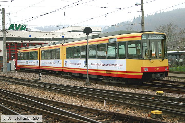 Stadtbahn Karlsruhe - 571 Triebwagen 571 in Ettlingen Stadt am 03. Juni 2006.