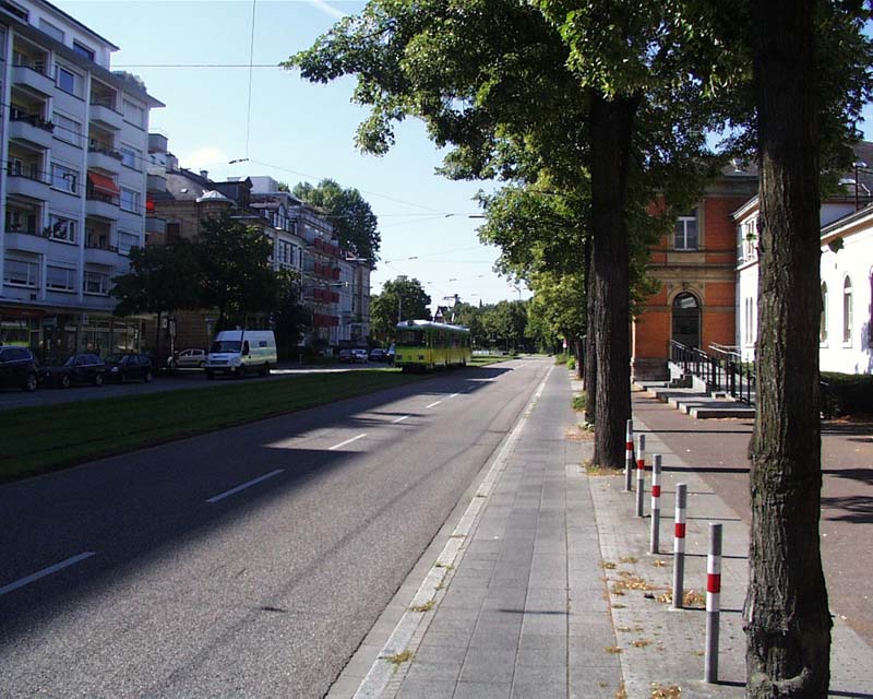 Since the tram line to Waldstadt was extended to the European School in December 2000, the Karlsruhe transport corporation runs special "school trams" on three different routes (marked 16, 17 and 18), which are only for use by pupils of the European School. Here we see tram car 119 ready to serve line 16.