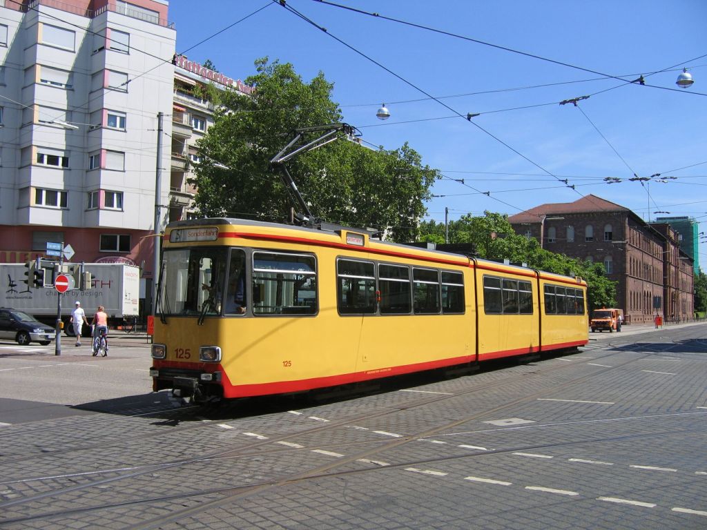 AVG-owned articulated tram car 125 on VBK tram line 6 to Oberreut