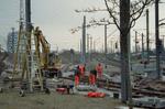 Track laying for additional storage tracks at Karlsruhe Albtalbahnhof. To make room for these new tracks the dam in the background carrying the south-western throat of Karlsruhe central station was partially removed. This was possible because two stub tracks of the central station were lifted.
