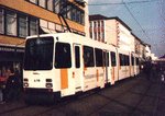Straßenbahn Kassel - 410 Triebwagen 410 auf Linie 6, aufgenommen am 04. März 1995. Bei den Triebwagen 401 bis 416 handelt es sich um hochflurige Zweirichtungs-Stadtbahn-Fahrzeuge des Herstellers DUEWAG Typ N8C (mit Choppersteuerung) aus dem Jahr 1981.