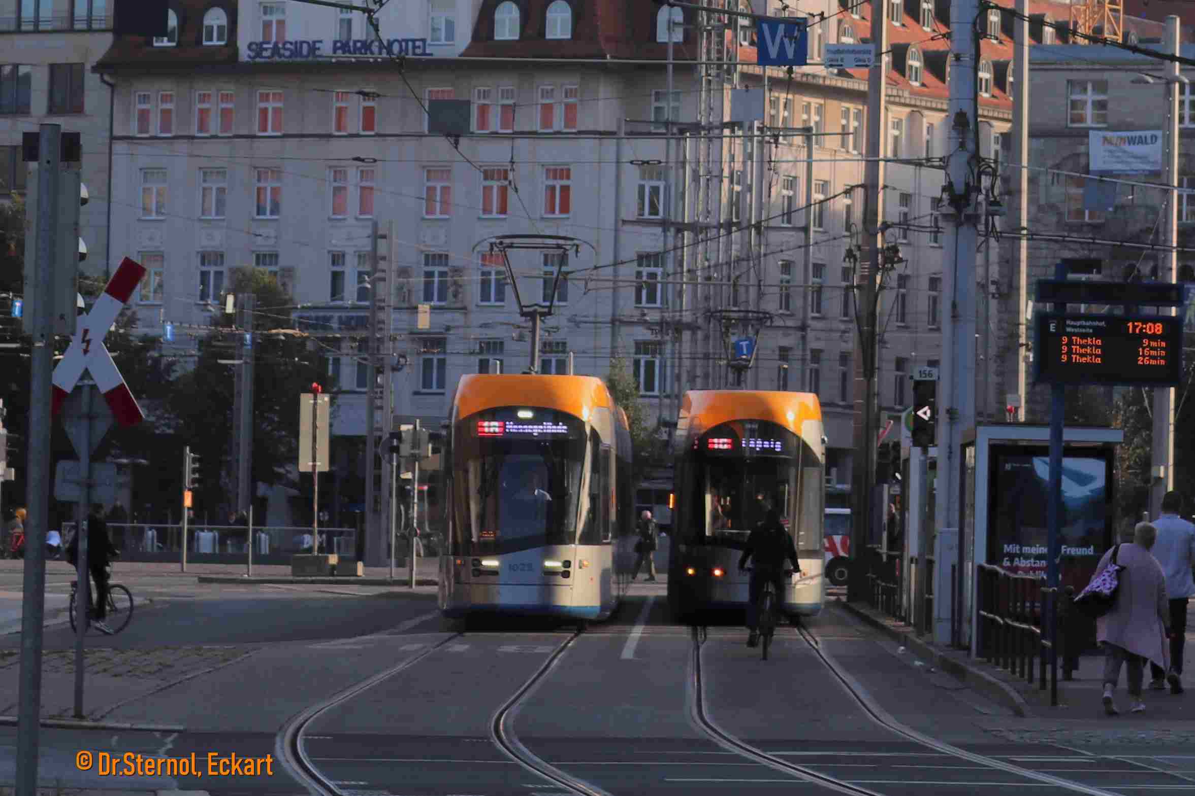 | Tram 1010 vom Typ NGT 10, Linie 16 nach Lößnig, vor der Hst Hbf. Rechts entschwindet eine 10 nach Wahren mit Tw 1129 und Bw 930. Dr. Sternol, Eckart (Foto) Dr.Sternol@t-online.de |