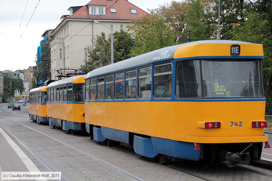 Straßenbahn Leipzig - 742 Beiwagen 742, aufgenommen auf Linie 11E an der Haltestelle G.-Schumann-/ Lützowstraße am 05. Oktober 2011. Vorn am Zug war Triebwagen 2181.
