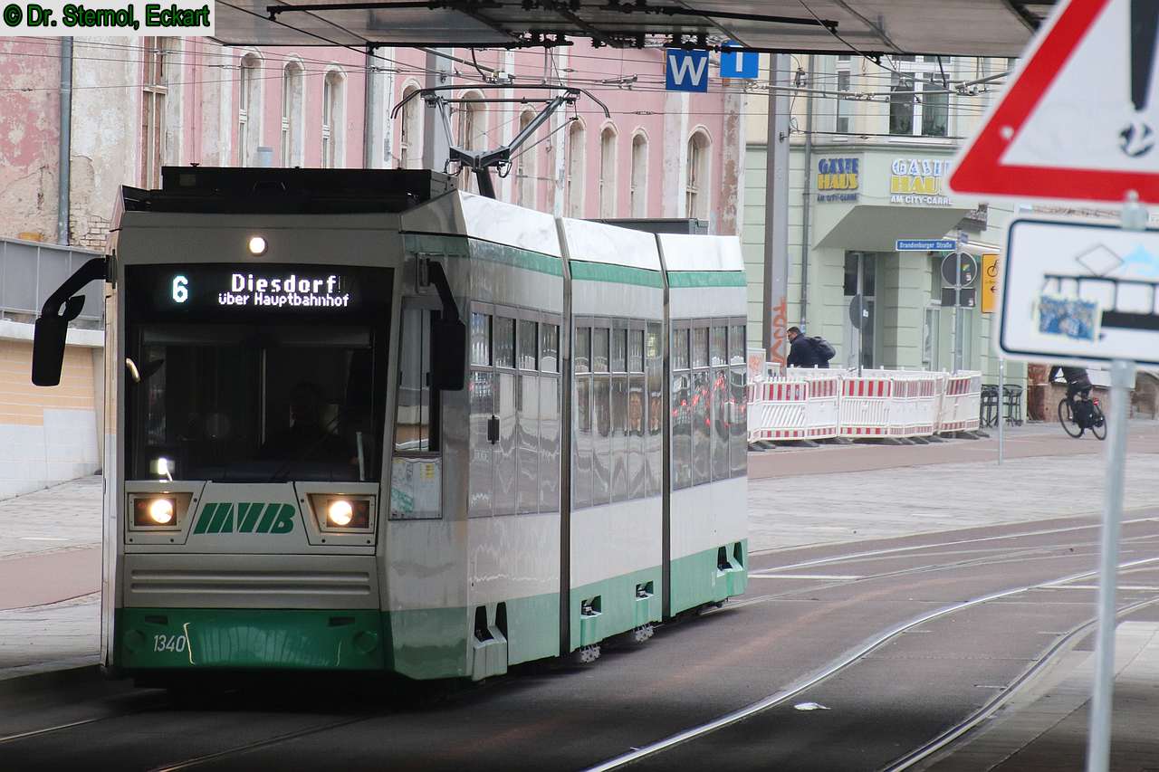 | Die Hst Hauptbahnhof /Kölner Platz befindet sich zwischen 2 Brücken, auf denen die Gleise liegen. Wagen 1340 steuert eben diese Hst an, um dann auf Linie 6 nach Diesdorf zu fahren. Dr. Sternol, Eckart (Foto) Dr-Sternol@t-online.de |