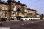 Straßenbahn Magdeburg - 1050 Triebwagen 1050 auf Linie 3 vor dem Hauptbahnhof, aufgenommen am 28. Juli 1990. Sowohl an der Fassade des Bahnhofsgebäudes als auch am Vorplatz wurde danach viel verändert.