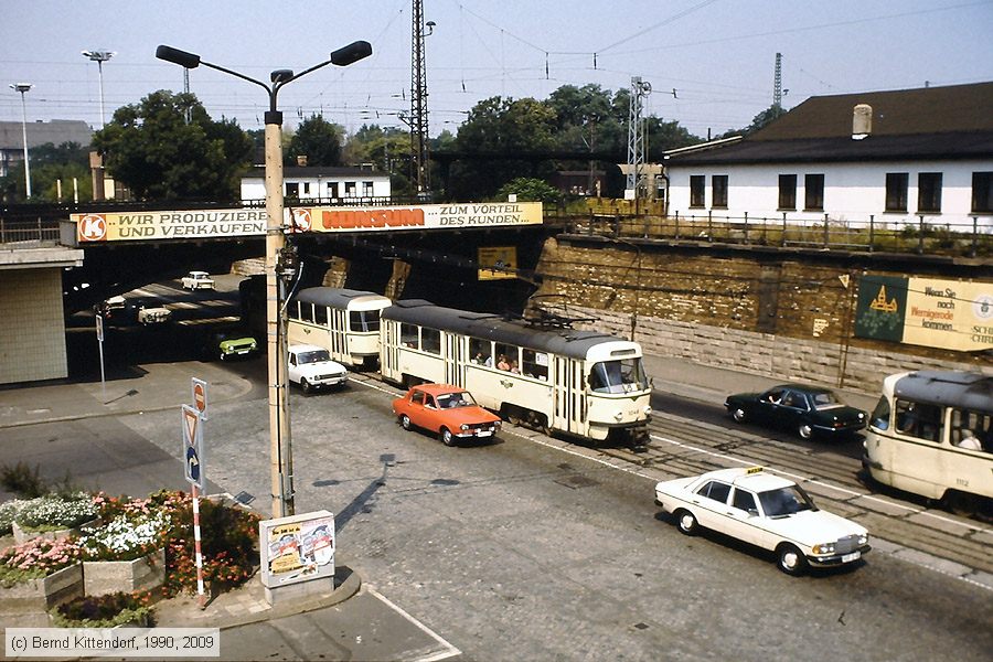 Straßenbahn Magdeburg - 1051 Triebwagen 1051 auf Linie 3 beim Hauptbahnhof, aufgenommen am 28. Juli 1990.