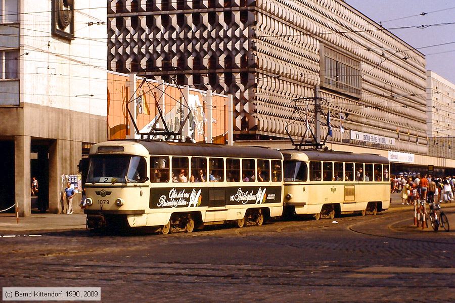Straßenbahn Magdeburg - 1079 Triebwagen 1079 auf Linie 2, aufgenommen am 28. Juli 1990.
