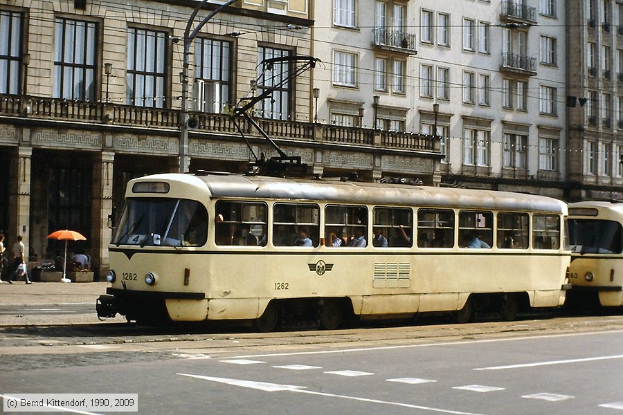 Straßenbahn Magdeburg - 1262 Triebwagen 1262 auf Linie 4 beim Hauptbahnhof, aufgenommen am 28. Juli 1990.