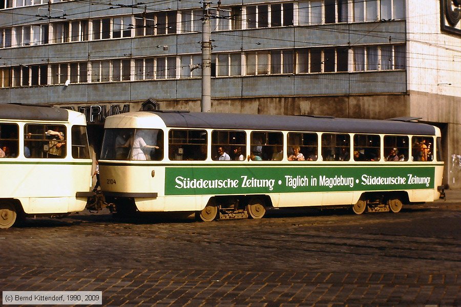 Straßenbahn Magdeburg - 2104 Beiwagen 2104 (mit Werbung für die Süddeutsche Zeitung), aufgenommen am 28. Juli 1990.