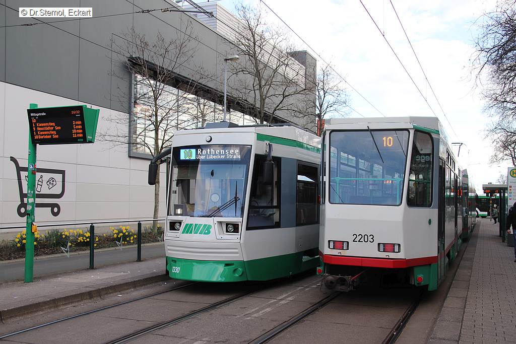 | An der Hst Hauptbahnhof Ost ist Bw 2210 eben abgefahren. Er folgt Tw 1310 und beide sind auf dem Wege nach Neustaedter See. Dr. Sternol, Eckart (Foto) Dr.Sternol@t-online.de |