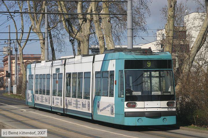 Straßenbahn Mannheim - 622 Triebwagen 622 am 04. März 2007 auf Linie 9 beim Hauptbahnhof.