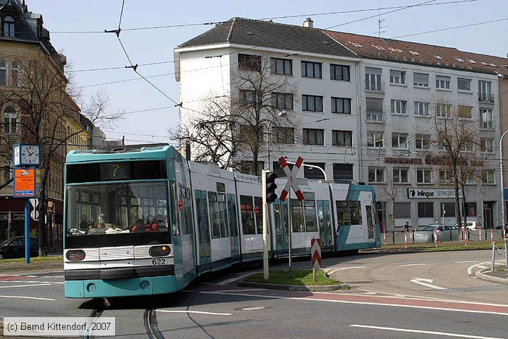 Straßenbahn Mannheim - 622 Triebwagen 622 am 04. März 2007 auf Linie 7 beim Hauptbahnhof.
