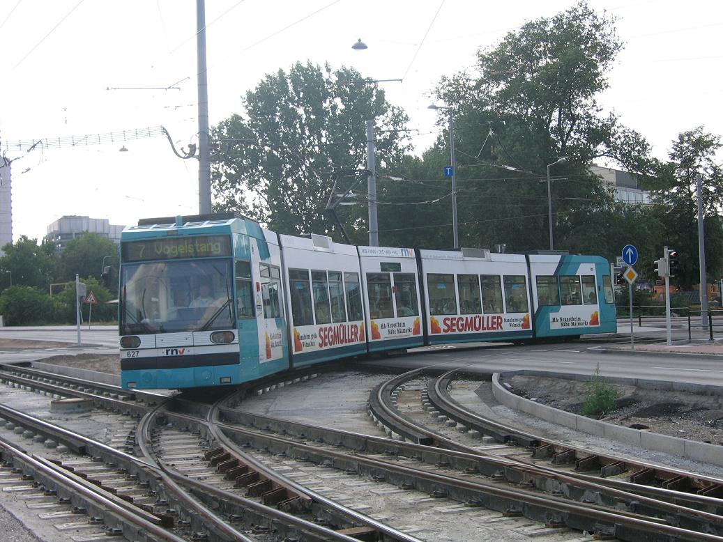 Straßenbahn Mannheim - 625 Triebwagen 625 am 31. Juli 2008 auf Linie 4 in Ludwigshafen Oggersheim bei der Fahrt in die Wendeschleife.