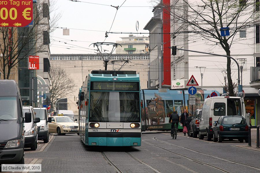 Straßenbahn Mannheim - 5625 Triebwagen 5625 auf Linie 4 am 30. März 2010 bei der Haltestelle Kaiser Wilhelm Straße in Ludwigshafen.