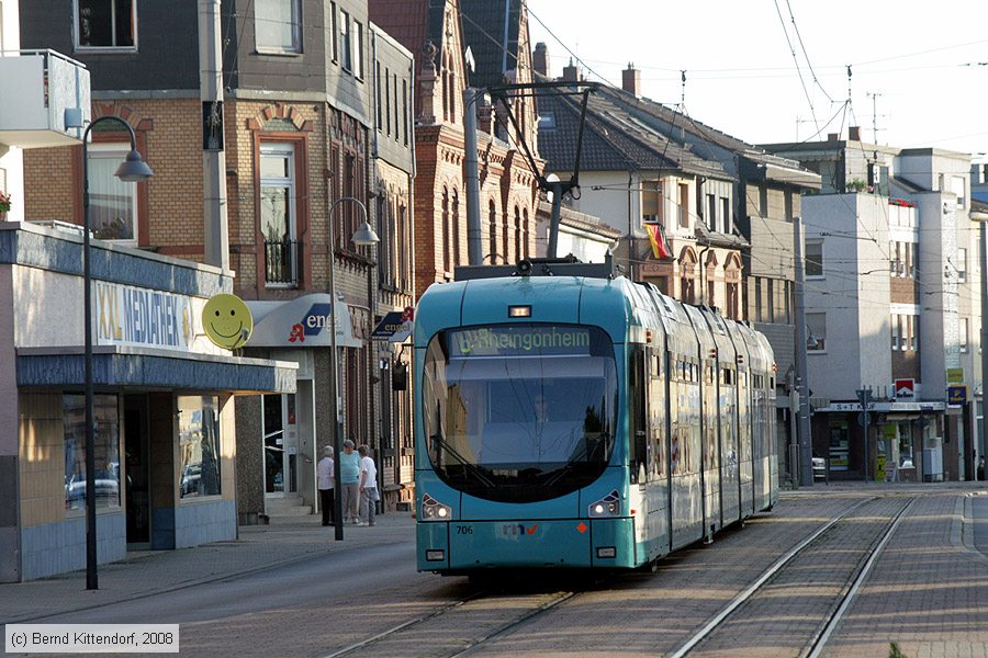 Straßenbahn Mannheim - 706 Triebwagen 706 auf Linie 6 am 26. Juni 2008 in Ludwigshafen Mundenheim nahe der Haltestelle Hoheneckenstraße.