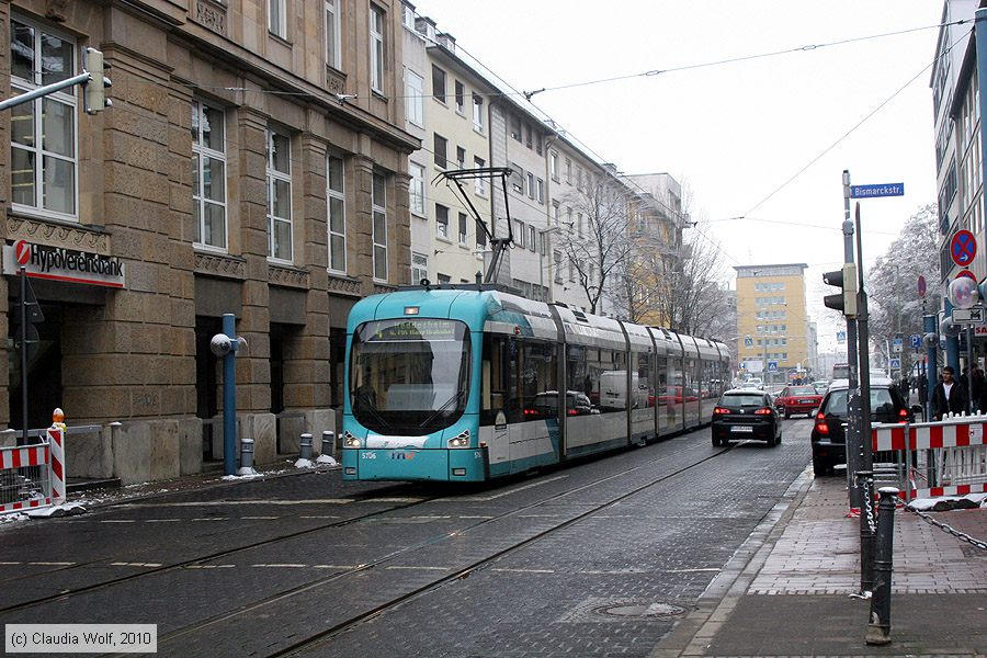 Straßenbahn Mannheim - 5706 Triebwagen 5706 auf Linie 4 in Ludwigshafen bei der Haltestelle Kaiser Wilhelm Straße, aufgenommen am 25. Januar 2010.