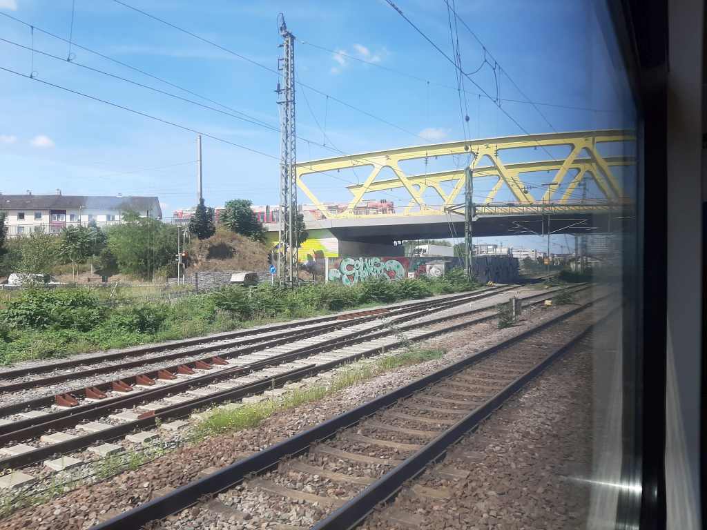 Mannheim Brücke Neckarauer Strasse mit Tram. Juli 2020. Aufnahme aus einer RE (425er) nach Mannheim Hbf. Photo by M.Koblischka |