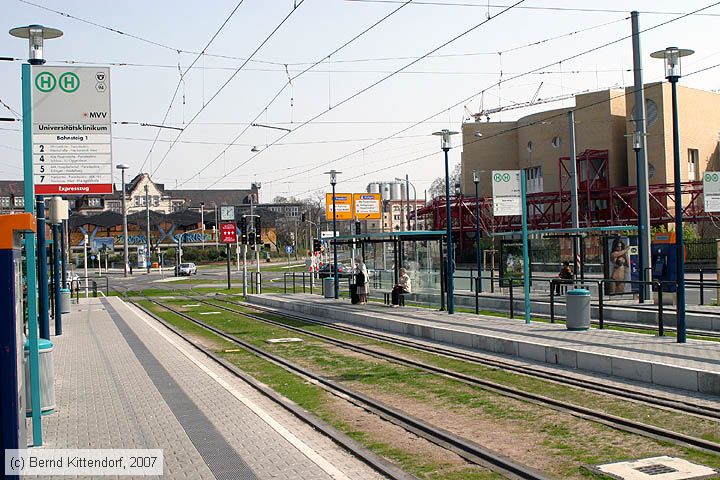 Straßenbahn Mannheim - Haltestelle Universitätsklinikum Haltestelle Universitätsklinikum am 01. April 2007. Die Gleise links führen in Richtung Käfertal, rechts geht es nach Feudenheim und Vogelstang.