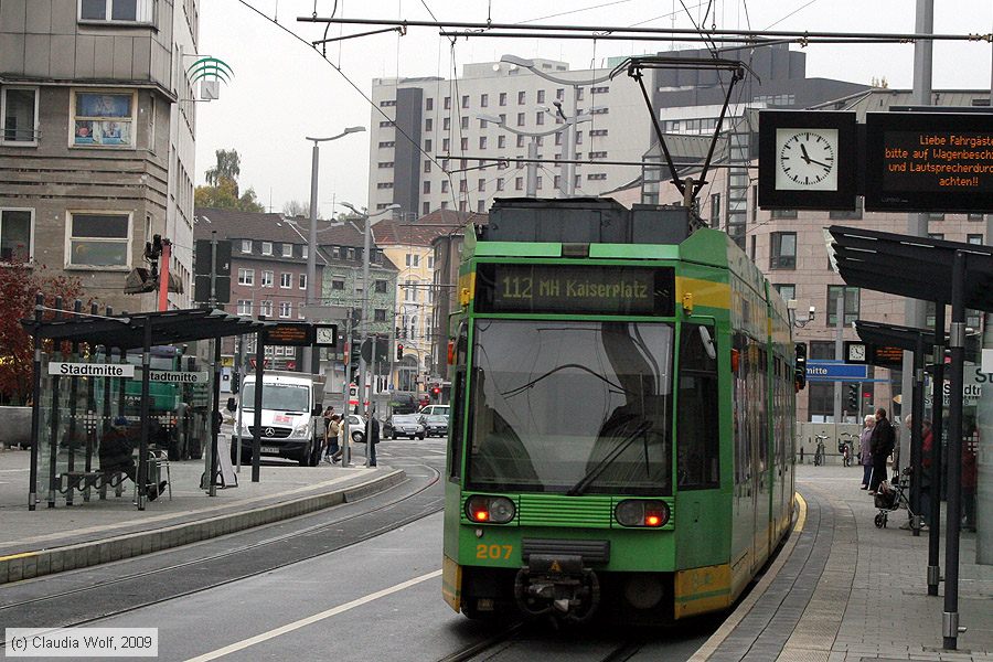 Straßenbahn Oberhausen - 207 Triebwagen 207 auf Linie 112 in Mülheim an der Ruhr bei der Haltestelle Stadtmitte, aufgenommen am 22. Oktober 2009.