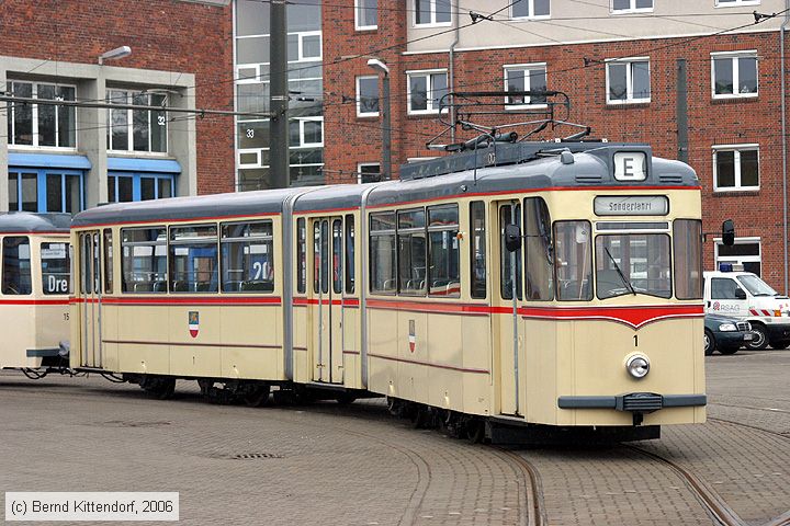 Straßenbahn Rostock - 1 Triebwagen 1 im Betriebshof, aufgenommen am 15. März 2006. Dieses historische Fahrzeug (Hersteller Gotha/LEW, Typ G4-61) stammt aus dem Jahr 1961. Bis 1994 wurde der Triebwagen unter der Nummer 701 eingesetzt. Das Aussehen entspricht dem Lieferzustand.