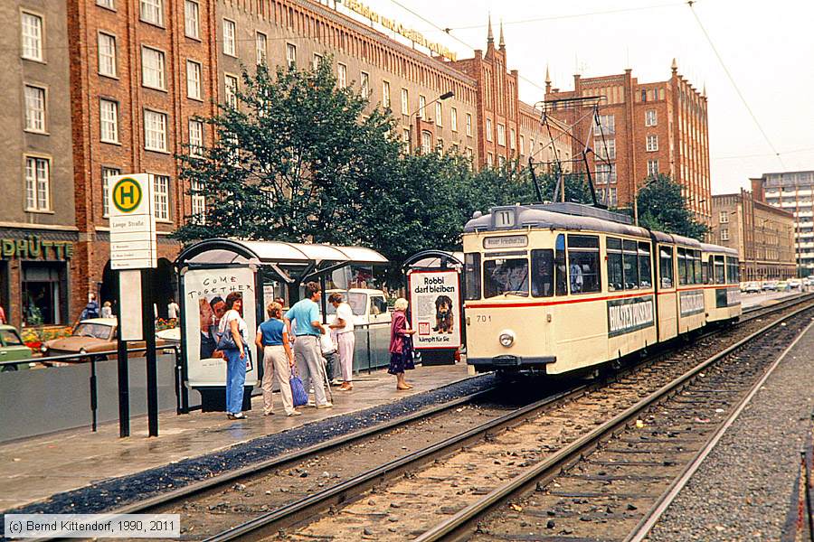Straßenbahn Rostock - 701 Triebwagen 701 (Typ G4-61, Hersteller Gotha, Baujahr 1961) auf Linie 11 an der Haltestelle Lange Straße, aufgenommen am 06. August 1990.