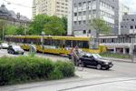 Stuttgart - Straßenbahn - 446 Triebwagen 446 (Meterspur, rechts im Bild) am 08. Juni 2007 auf Linie 15 an der Haltestelle Olgaeck. Links daneben ist der Triebwagen 3199 (Normalspur) zu sehen.